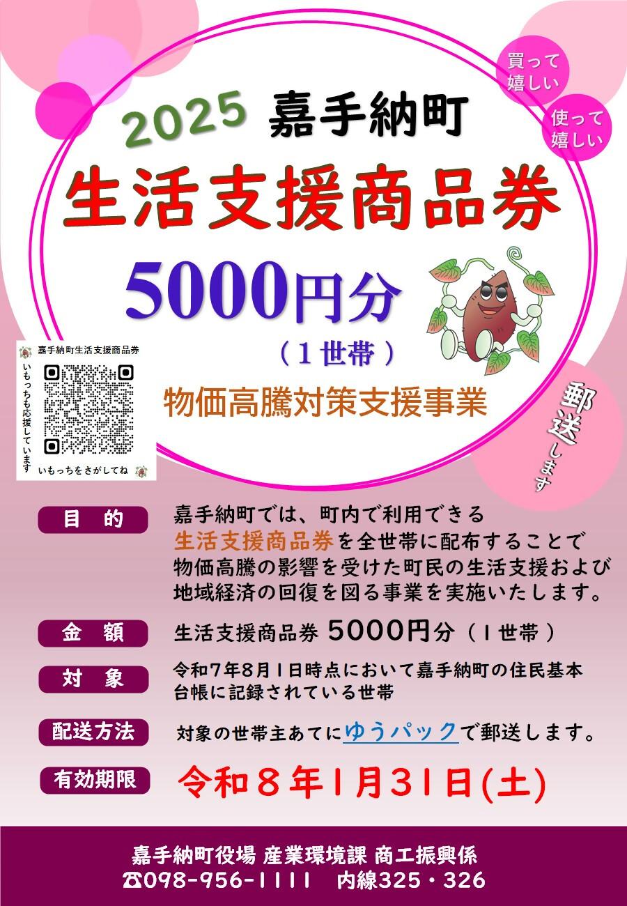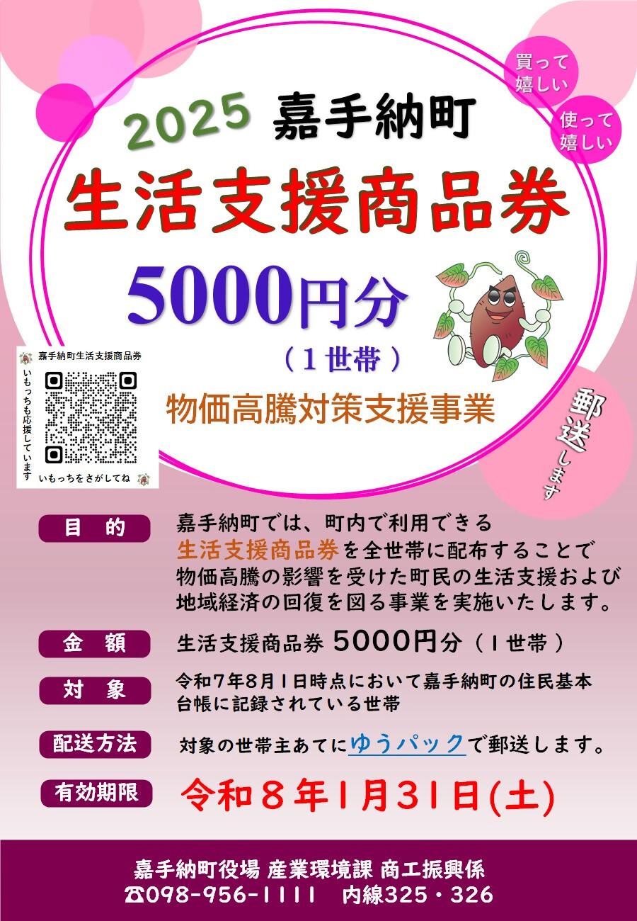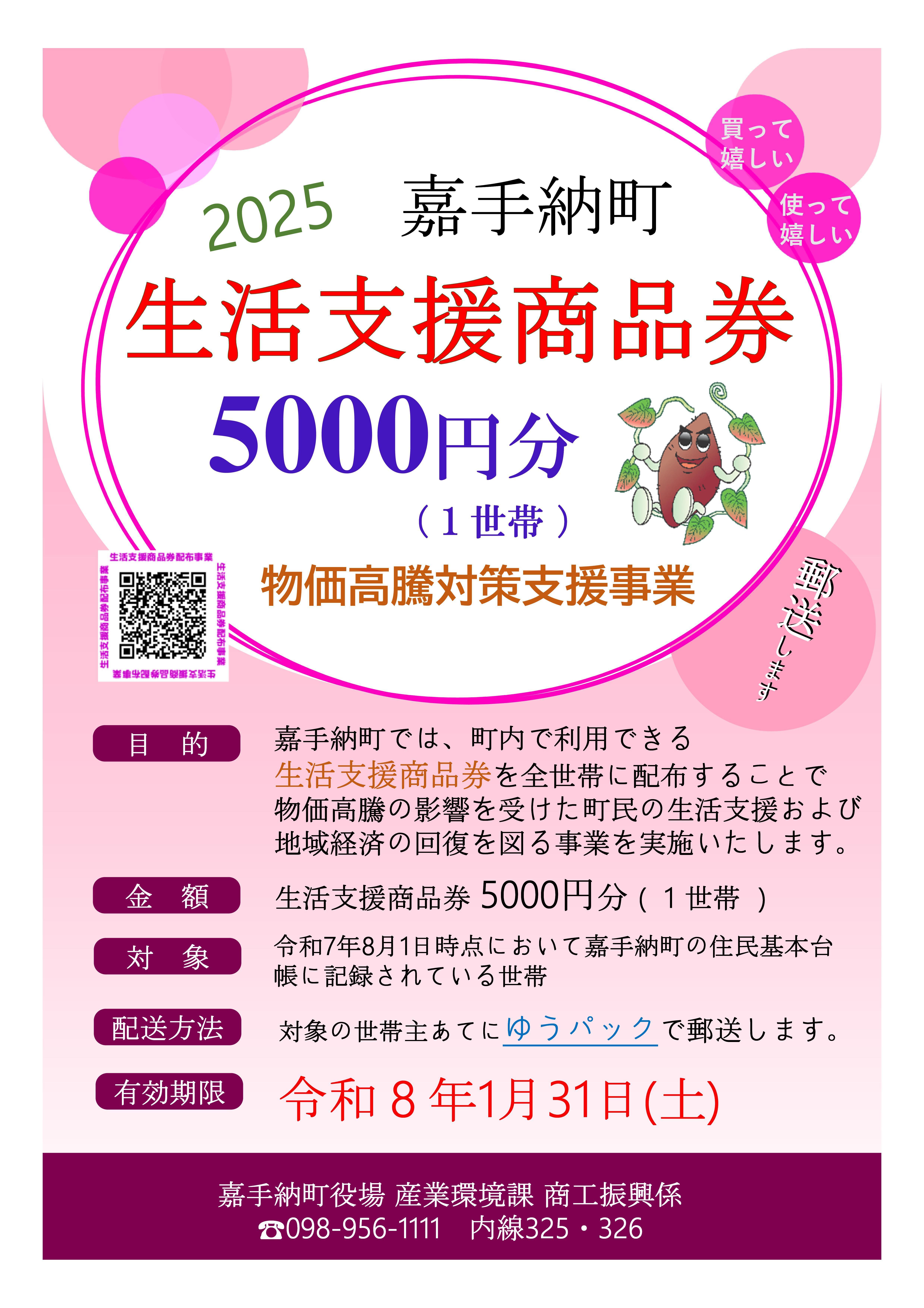 物価高騰により影響を受ける町民を支援するため、町内の対象店舗のみで利用可能な商品券を嘉手納町の全世帯に配布することで、落ち込んだ地域経済の回復を図ることを目的としています。