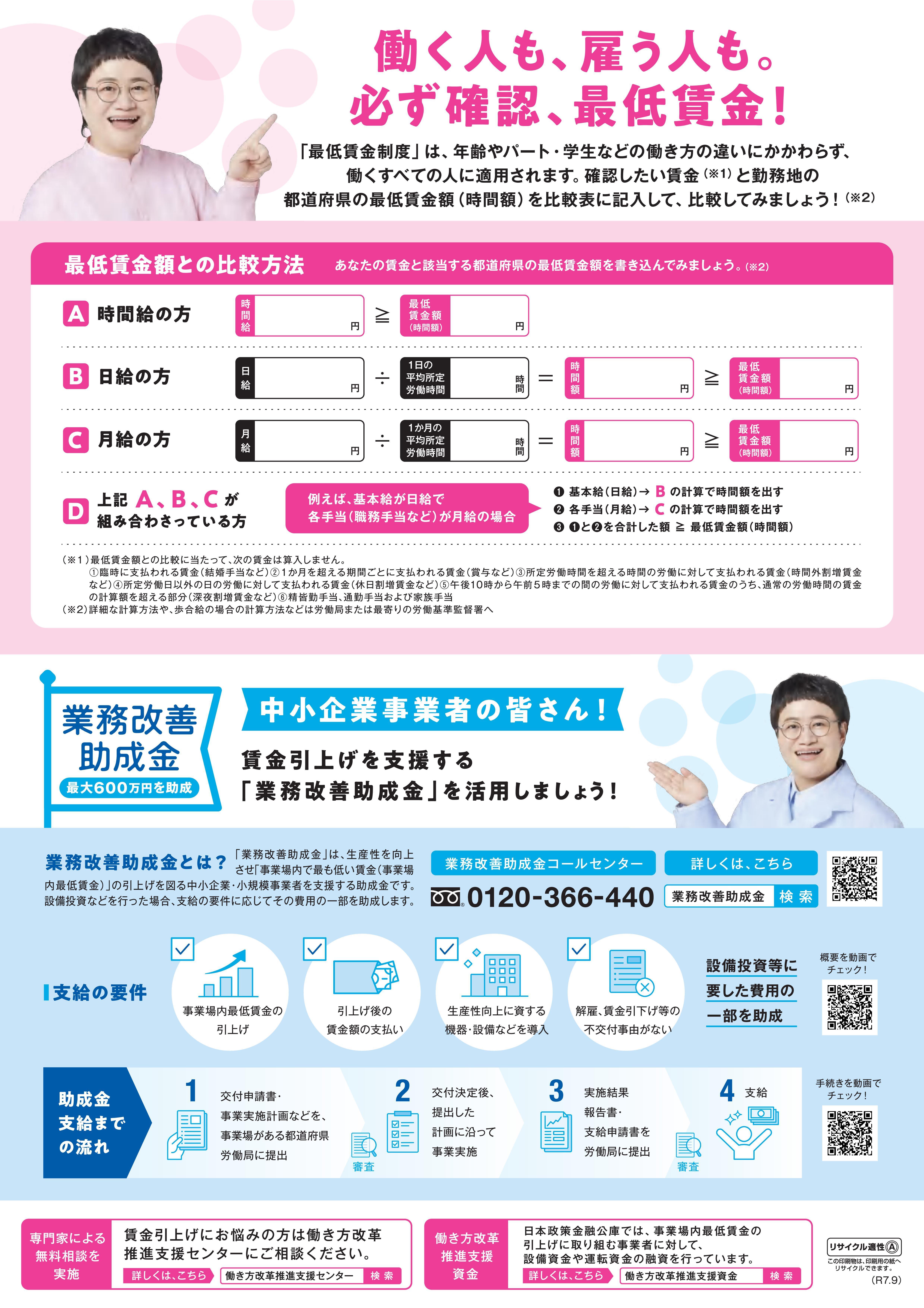 また、事業者の皆様向け、最低賃金引上げに伴う国の支援策もありますので、こちらをご確認ください。