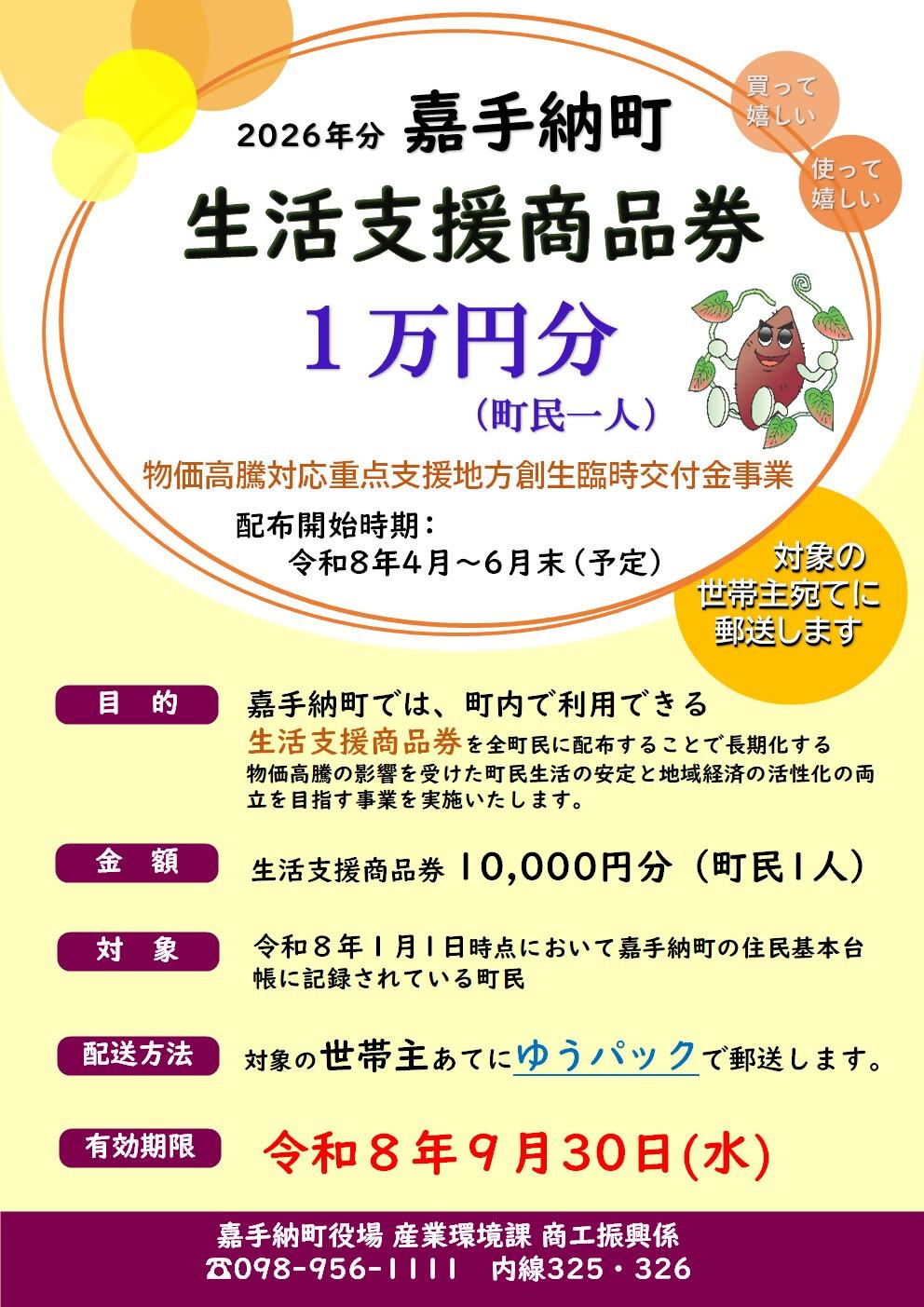 物価高騰の影響を受けた町民の個人消費を下支えするため、町内の対象店舗のみで利用可能な商品券を全町民に配布することにより、落ち込んだ地域経済の回復を図ることを目的としています。